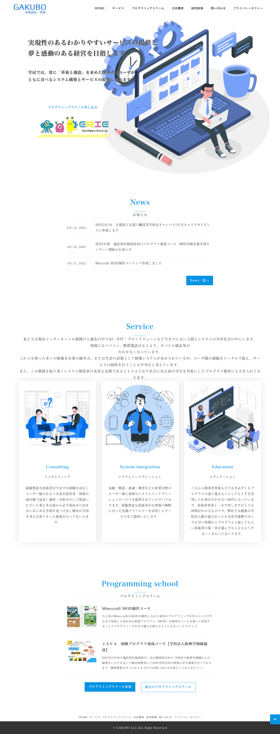 プログラミングスクールを運営されている学房様。事業のイメージに合った構造・画像選定などデザインから公開まで一手に担当させていただきました。